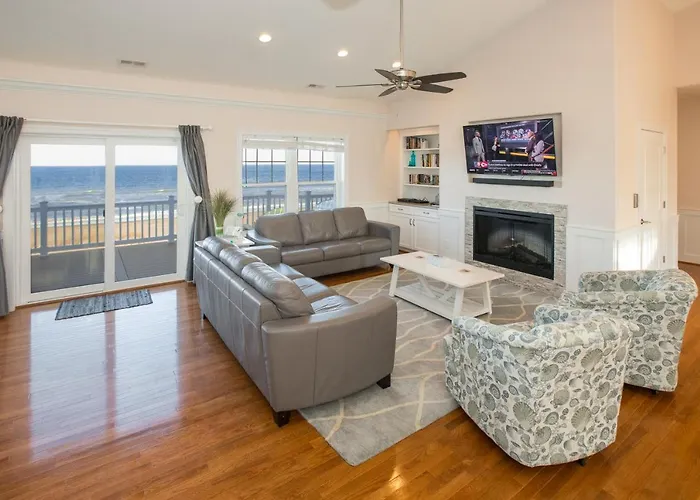 Gasten kunnen genieten van een kust uitzicht op de zee vanaf een zonneterras in deze 9-slaapkamer Sandfiddler Virginia Beach villa, op afstand van 4 km van Lotus Garden Park. Het vakantiehuis ligt gesitueerd op het strand en heeft een zwembad waar gasten kunnen ontspannen.